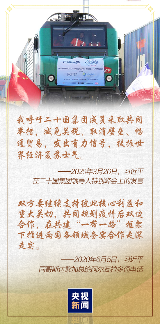 “中歐兩大經(jīng)濟體應該發(fā)揮世界經(jīng)濟‘雙引擎’作用,拉動世界經(jīng)濟復蘇,共同支持科學有序復工復產(chǎn),加強宏觀經(jīng)濟政策協(xié)調(diào),維護全球產(chǎn)業(yè)鏈供應鏈穩(wěn)定通暢?!?6月22日晚,視頻會見歐洲理事會主席米歇爾和歐盟委員會主席馮德萊恩時,習近平主席的表態(tài)為面臨下行壓力的世界經(jīng)濟注入信心。